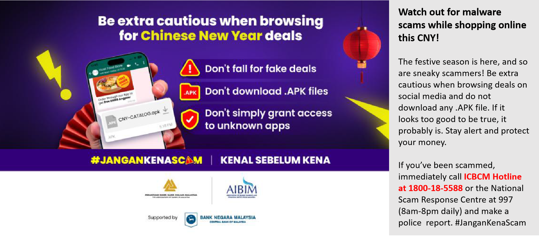 节日来临,狡猾的骗子也随之而来!在社交媒体上浏览优惠时要格外小心,切勿下载任何 .APK 文件。如果看起来好得难以置信,那很可能是骗局。保持警觉,保护您的财产安全。如果你不幸掉入诈骗陷阱,请立马联系工银马来西亚热线 1800-18-5588 或国家诈骗应对中心热线:997 (每天 8am-8pm)并报警。#JanganKenaScam