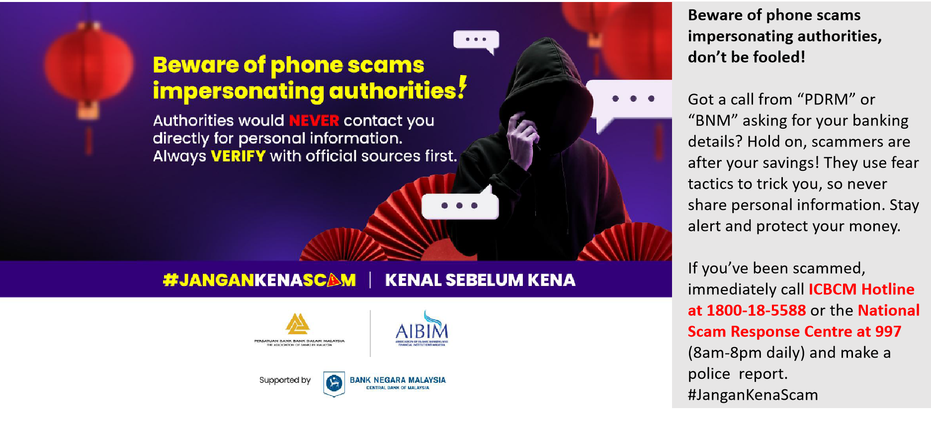 接到“PDRM”或“BNM”的电话,要求提供银行信息?小心,骗子盯上了你的存款!他们利用恐惧心理进行诈骗,所以千万不要泄露个人信息。保持警惕,保护好你的钱财。如果你不幸掉入诈骗陷阱,请立马联系工银马来西亚热线 1800-18-5588 或国家诈骗应对中心热线:997 (每天 8am-8pm)并报警。#JanganKenaScam